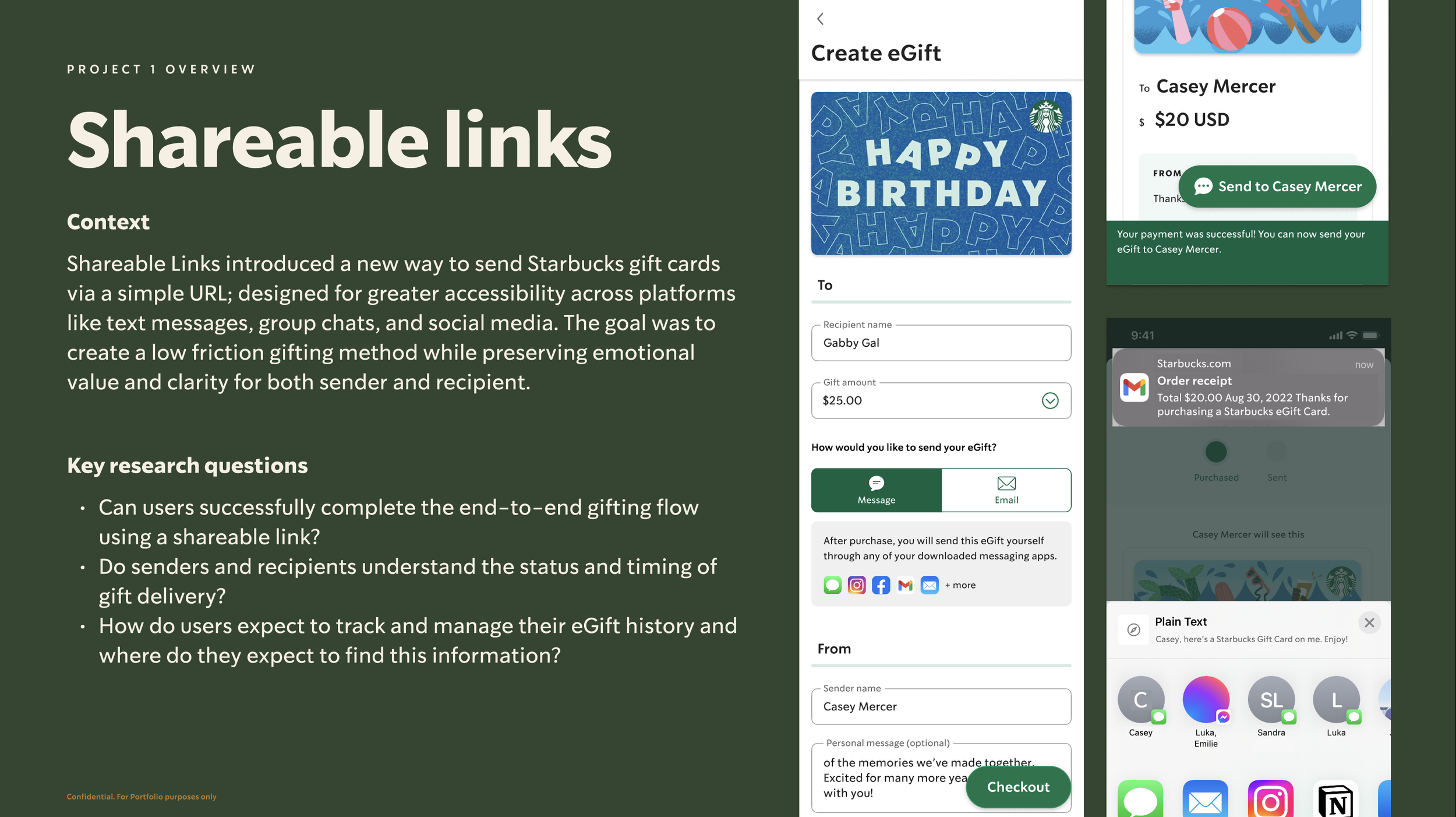 I learned the value of layered research, from generative mental model studies to post-launch evaluations, to ensure designs were aligned with real-world behavior. I also saw firsthand how impactful small changes in UX writing could be in reducing friction and anxiety. Collectively, this work helped shape a more thoughtful, diverse gifting ecosystem at Starbucks; one that better reflects how people express care, celebrate, and stay connected.